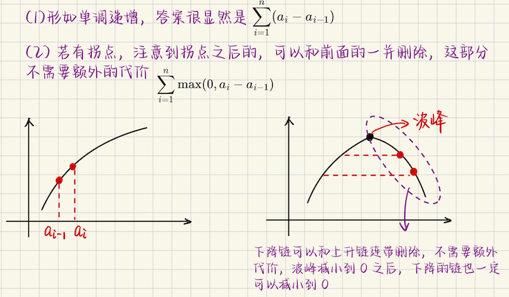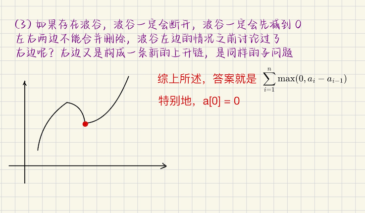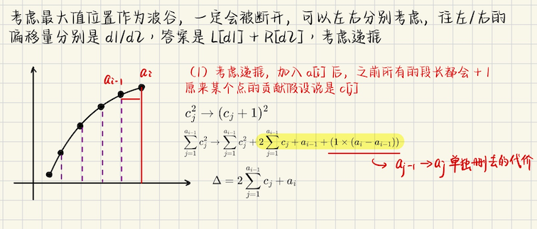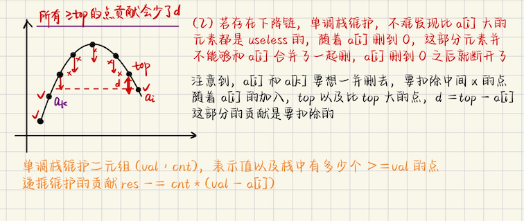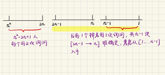 ## 牛客小白月赛121 ### D **[D-谁敢动资本的蛋糕](https://ac.nowcoder.com/acm/contest/117762/D)** 给定`a[1...n]`,每次操作任意选择两个下标`i, j`,将$$a_i, a_j$$删掉,用$$a_i \oplus a_j$$来替换 代价是`2(a[i] & a[j])`,现在问,总代价的和最小是多少? **算法分析** 利用恒等式 ```math \displaystyle x + y = (x \oplus y) + 2(x \textbf{ and } y) ``` 总代价是不变的,$$\sum a_i - \bigoplus a_i$$ ### E **[构造序列](https://ac.nowcoder.com/acm/contest/117762/E)** 问构造长度为$$n$$的序列的方案数,每个数$$1 \leqslant a_i \leqslant m$$,另外,还必须满足,序列是好的 序列是好的,定义如下,能够将序列划分成若干连续的段,每个段中的元素都相等,并且任意相邻段颜色不相等 划分成连续的段有要求,假设划分成`k`段,每一段长度是$$l_1, l_2, \cdots, l_k$$,必须满足$$l_1 < l_2 < \cdots < l_k$$ 问构造序列的方案数 **算法分析** 如果我们知道了划分成$$k$$段,那么相当于给每一段染色,相邻的段不能染同样的颜色 第一段有`m`种选择,第二段有`m-1`种,第三段呢,还是`m-1` 染色的方案数是$$m \cdot (m-1)^{k-1}$$ 最后的答案是$$\sum_k ways(k) \cdot m(m-1)^{k-1}$$ > 下面考虑,把$$n$$划分成$$k$$个,**严格单调增**的数的方案 这是一个整数划分问题,假设说考虑前$$i$$个数,划分成了$$k$$段,每一段的长度都比前一段**严格单调增** 同时,不能用空段,这样的方案数记为$$dp(i, k)$$ > 如果划分的段的长度包含`1` 那么我们考虑**每一段都减去 1 个最小的数**,不难发现,这时候只有$$k-1$$段了,那个长度为`1`的段变空了 这个时候总共有几个数呢?一共有$$i - k$$个数 所以方案数是$$dp(i-k, k-1)$$ > 如果划分的段的长度不包含`1` 那么每一段都减去一个数,还是对应有$$k$$段,但是还剩下$$i - k$$个数,方案数是$$dp(i-k, k)$$ 所以递推是$$dp(i, k) = dp(i-k, k-1) + dp(i-k, k)$$ ## CodeTON Round 7 ### G **[G. Pepe Racing](https://codeforces.com/contest/1896/problem/G)** 有$$n^2$$个人,编号分别是$$1, 2, \cdots, n^2$$,速度两两不同 现在一次询问可以任意选`n`个人,你只会知道,速度最快的那个人的编号 问是否有可能在$$2n^2 - 2n + 1$$次的询问,确定速度最快的$$n^2 - n + 1$$的人 按速度从大到小排序即可,速度最慢的$$n-1$$个人没有必要区分开来 **算法分析** > 如何确定速度最快的那个人? 分块,`[1, n] [n+1, 2n] [2n+1, 3n] .... [(n-1)n+1, n*n]`,对于第$$i$$块,范围$$[(i-1)n+1, in]$$ 这样,分别对每一块进行查询最大值,耗费`n`次询问,得到一个长度为$$n$$的序列 记为$$b_1, b_2, \cdots, b_n$$,再针对`b[...]`进行一次最大值查询,也就是说$$n+1$$次查询,确定最大值 > 暴力怎么做? 顺着这个思路,自然而然想到,耗费$$n$$次确定序列`b[...]`,然后接下来的查询都是针对`b`的 怎么查询次大值呢? 1.需要知道最大值`mx`在的那个块的编号`idx`,不妨叫**被删块** 2.去`block[idx]`中把`mx`删掉,然后再从其他编号$$\neq idx$$的块中,选一个**非该块最大值,没选过的**元素 插入到**被删块**中 3.针对被删块,`b[idx]`,询问一次最大值,更新`b[idx]`,然后呢?再一次对全局的`b[1...n]`做一次询问 这样就能确定次大值 ```bash 1次 查询,确定最大值 r[N] 接下来,次大值到目标,确定一个值需要 2 次询问 ``` 总的询问次数是,确定最大值,需要$$n + 1$$次询问,接下来还需要确定$$n^2 - n$$个人 每个人需要$$2$$次询问,总的询问次数是$$(n+1) + 2(n^2 - n) = 2n^2 - n + 1$$次,多了$$n$$次 > 怎么优化掉$$n$$?考虑后面的若干询问,能不能不要`2`次,而是只问一次? 也就是说,`2`次的询问,不能问太多,原来针对$$(n^2 - n)$$个数,现在看下$$(n^2 - n - n = n^2 - 2n)$$个数行不行 > 在重新分析一下 首先,分块进行$$n$$次操作,确定数组`b[1...n]`是必不可少的,接下来每确定一个排名,需要`2`次操作 ```bash 1 次操作针对 b[1...n] 全局询问,确定当前第 k 大 第 2 次操作,确定 kth number 所在的块的 idx,然后 block[idx] 删去 kth 从非被删块(其他块),找一个不是最大值的,没被选过的数,补充到 idx 这个块中 花费一次操作,更新 b[idx] ``` 如上所示,确定一个排名,需要一次全局询问,一次**补充更新**,`2`次操作 一次需要排名$$n^2 - n + 1$$个人,原来一个排名要`2`次询问,现在要节省出$$n$$次询问 说明**恰好有$$n$$个人,只需要`1`次询问确定排名**,剩下的$$n^2 - 2n + 1$$个人仍然是`2`次询问 换句话说,$$n + 2(n^2 - 2n + 1) + (n - 1)$$ 另外,**被选为块内最大值的数**,需要标记(最大值标记) > 数形结合考虑这个表达式  注意到`[n, 2n-1]`一共有`n`个数,也就是说,我们要迭代`n`次 每次操作,之前都是需要**全局查询一次**确定第`k`大,然后再更新`b[idx]` 直接确定$$[2n-1 \to n]$$的排名难度很大,每确定一个名次需要`2`个询问,能不能转而考虑$$[n-1\to 1]$$ 实际上,对于**最后的**$$2n - 1$$个数,可以考虑**只全局查询最大值,不进行块更新询问** > 我们期望的是 迭代`n-1`次,每一次只针对全局的`b[...]`查询最大值,因为**所有的数都两两不同** 1.查询完之后,删除当前`kth number`,删除前,记得**打上最大值标记** 2.然后呢,暴力地找**没有打上最大值标记**的数,添加到全局的`b[...]`中,直到`b[...]`长度恰好是`n` 这样可以吗?注意到剩下的数一共有$$2n - 1$$个,而仍然有`b[1...n]`,$$n$$个块 说明每个块中都有`2`个元素,恰好有一个块中仅有`1`个元素 注意到**之前,我们把选为块内最大值的数都标记了** ```bash 块中的元素情况如下 (max[1], ?), (max[2], ?), ...., (max[n-1], ?), (maxn, ) ``` 块中的元素情况如上,迭代`n - 1`次,一定可以筛选出**接下来第`[1~n-1]`大