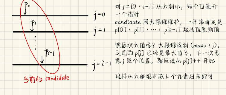 ## CodeTON Round 8 ### C1 **[C1. Bessie's Birthday Cake (Easy Version)](https://codeforces.com/contest/1942/problem/C1)** 给定凸的$$n$$多边形,顶点编号是$$1 \sim n$$,现在选定一些点,问这些点能够连成多少个三角形 一共能选的点有$$x$$个 连成的三角形指的是三角剖分中,三角形的数量 **算法分析:关于三角剖分** **结论1** 从$$n$$个顶点能画出的对角线总数(任意两个顶点可以相连,但不能算上原来的边) ```math \displaystyle \binom{n}{2} - n = \dfrac{n(n - 3)}{2} ``` 任意取两个点构成$$\binom{n}{2}$$条线段,原来就有$$n$$条边,扣除,剩下都是对角线 **结论2** 把一个$$n$$凸多边形做三角剖分(用不相交的对角线,把多边形完全划分成三角形) 三角形的个数$$T = n - 2$$ 用到的对角线数(每次剖分增加的对角线数)$$d = n - 3$$ > 结论 2 的推导 **直接统计** 假设剖分后有$$T$$个三角形,剖分对角线数是$$d$$,那么 三角形边的计数总和是$$3T$$,这些计数由原来的边$$n$$条,以及内部的对角线$$d$$构成 每条对角线计算了$$2$$次,所以$$3T = n + 2d$$ 另一方面,把$$n$$边形划分成$$T$$个三角形,需要切割的次数,显然是一个对角线切一次 需要切$$T - 1$$次,所以$$d = T - 1$$,那么$$3T = n + 2(T - 1)$$ 从而$$T = n - 2, d = n - 3$$ **递推** 用$$f(n)$$记$$n$$边形的三角剖分的**三角形个数**,注意到每一次可以找到相邻`3`个顶点构成的三角形 将其切去,剩下的又是一个子问题,对应$$f(n - 1)$$ 从而有$$f(n) = f(n-1) + 1$$ 递推的终点(首项)是$$f(3) = 1$$,根据等差数列递推,$$f_3 + (n-3)\cdot 1 = f_n$$,从而$$f_n = n-2$$ **欧拉公式** 欧拉公式的表达式是$$V - E + F = 2$$ 其中,$$V$$是顶点数,$$E$$是边数,$$F$$是平面数 那么对应$$V = n$$,假设三角剖分形成$$d$$条对角线,那么$$E = n + d$$ 面数呢?假设分成$$T$$个三角形,面数是$$F = T + 1$$,(最外部的平面也算一个面) 综上,有$$n - (n+d) + (T + 1) = 2$$,从而$$T = d + 1$$ 另外,$$3T - d = E$$,因为每条三角剖分的对角线被多算了一次 所以又有$$3T - d = n + d$$,推出$$T = n - 2$$ > 再来考虑这个问题 如果$$x = n$$,那么答案就是$$x - 2$$ 否则的话呢?答案最少是$$x - 2$$,再一些情况下,可能这个答案会增加,什么情况下答案会增加呢? 如果$$a[i] - a[i-1] > 2$$,那么你一定要选$$(i-1, i)$$,而$$[a\_{i-1}, a\_{i}]$$中间的点 一定都不会被选,不会有新的三角剖分产生 而如果$$a\_{i} - a\_{i-1} = 2$$,那么$$[a\_{i-1}, a\_{i}]$$中间还必然夹杂着一个点 这个点必然会构成一个三角剖分,那么这个点也要**作为必选点,考虑进去** 最终的答案是`(必选点的个数) - 2` 当然,注意是一个环形的,环的首尾,`a[1] - a[n] + n = 2`也单独存在一个合法点 ### C2 **[C2. Bessie's Birthday Cake (Hard Version)](https://codeforces.com/contest/1942/problem/C2)** **算法分析** 有了 C1 的结论之后,这种情况下,我们能够额外添加`extra`个点 考虑到对已有的点进行排序,每相邻两个点,`l = a[i-1] + 1, r = a[i] - 1`,那么$$[l, r]$$区间内的点都是未染色的 根据之前的分析,这些点如下进行类似二分图交错染色 如果是奇数 ```bash o -- x -- o -- x -- ... -- o -- x -- o x 表示染色的点 ``` 那么这一整段都会变成**有效节点**,没有浪费 如果是偶数呢? ```bash o -- x -- o -- x ... -- o -- x ``` 会有一个浪费 那么我们贪心的思路就比较明显了,用一个二元组$$(d, [l, r])$$维护 按照$$d$$(间隔)从小到大染色 先处理`d = 奇数`,从小到大染色,然后再处理`d = 偶数`,从小到大染色 这样就不会有浪费了 ### D **[D. Learning to Paint](https://codeforces.com/contest/1942/problem/D)** 用一个`n`个格子组成的画布,编号从`[1...n]`,可以选择任意的格子染色 给定一个二维数组$$a$$,用来评价得分 对一个画布,其被涂色的**最大连续区间**是$$[l_1, r_1], [l_2, r_2], \cdots, [l_x, r_x]$$ 画布的美丽度是所有的$$a[l_i, r_i]$$之和 ```math \displaystyle \sum_{i = 1}^{x} a_{l_i, r_i} ``` 一共有$$2^n$$种不同的染色方式,问最大的$$k$$个美丽值是多少?$$n \leqslant 10^3$$ **算法分析** 先考虑朴素的 dp,根据每个格子染色与否,可以设计出状态转移方程 ```math \displaystyle dp_{i, 0} = \max(dp_{i-1, 0}, dp_{i-1, 1}) \\ dp_{i, 1} = \max_{0 \leqslant j \leqslant i-1} (dp_{j, 0} + a_{j+1, i}) ``` 关于第一个表达式,维护前$$k$$大很简单,实际上,这里的$$dp(i, 0), dp(i, 1)$$表示的并不是一个值 **而是一个大小最多为 k 的有序数组**,按照**从大到小**$$\geqslant$$排序 这样第一个方程的状态转移,等价于有序数组的**归并** 第二个表达式,如果按照$$\\{dp(j, 0) + a(j+1, i)\\}$$有序数组归并 对于每个$$i$$,代价都是$$O(nk)$$,整体的代价是$$O(n^2 k)$$,考虑优化 能够优化的点是,对于$$i-1 \to i$$,不用每次都`for j = 0 to i-1`,考虑能不能复用上一次求出来的$$dp(j, 0)$$的结果 **考虑堆优化**  ### E **[E. Farm Game](https://codeforces.com/contest/1942/problem/E)** 给定一个农场,可以抽象成边界是$$0, l+1$$,而$$[1, 2, \cdots, l]$$是空位 现在 FJ 和 FN 玩游戏,两个人都各自有$$n$$头牛,共$$2n$$头牛,他们把牛放到不同的整点上 并且 FN, FJ 各自的奶牛都互不相邻 要么是$$0 < a_1 < b_1 < a_2 < b_2 < \cdots < a_n < b_n$$ 要么是$$0 < b_1 < a_1 < b_2 < a_2 < \cdots < b_n < a_n$$ 一次移动,可以选择一个$$1 \leqslant k \leqslant n$$,以及一个方向 然后会选择$$k$$头牛向这个方向移动一个单位,不能把牛移动到墙上 或者另外一个玩家的牛上,如果一个人再也无法移动他的牛,他就输了,FJ 先手 给定$$l, n$$,保证$$n \leqslant l/2$$,问双方采用最优策略的情况下,FJ 能够赢的初始奶牛排列的方案数 当然了,有时候