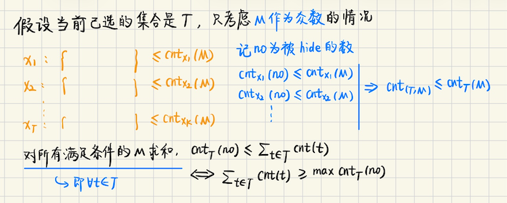 ## Codeforces Round 955 ### D **[D. Beauty of the mountains](https://codeforces.com/contest/1982/problem/D)** 给定两个`n * m`的矩阵,第一个矩阵表示山脉,第二个矩阵是`01`矩阵,表示山脉类型 现在可以对任意$$k \times k$$子矩阵进行操作(`k`给定),把区间内所有山的高度`+= c` 注意,`c`可以是负数,现在问能不能使得两类山的高度之和相等(高度之和变成负数也没关系) 输出`yes or no` **算法分析** 不妨设最开始两种类型的山脉的和分别是$$A, B$$,枚举子矩阵起始位置$$(i, j)$$,因为子矩阵的边长是确定的 这样子矩阵也就随之确定 只需要关注子矩阵内有多少个`0, 1`,比如第一个子矩阵有$$x_1$$个`0`,$$y_1$$个`1` ```math \displaystyle A + c_1x_1 + c_2x_2 + \cdots + c_kx_k = B + c_1y_1 + c_2y_2 + \cdots + c_ky_k \\ (x_1-y_1)c_1 + (x_2-y_2)c_2 +\cdots + (x_k - y_k)c_k = B - A ``` 不定方程整数解的判定,可以用裴蜀定理,需要$$\text{gcd}(\cdots) \mid (B - A)$$即可 ## Codeforces Round 956 ### D **[D.Swap Dilemma](https://codeforces.com/contest/1983/problem/D)** 给定两个序列`a, b`,问能否将他们变得完全相同,每次操作,在`a`中任选两个位置`l, r` 交换$$a_l, a_r$$,同时`b`中任选两个下标`p, q`,满足$$r-l = q-p$$,交换`b[p], b[q]` 可以的话输出 YES,否则输出 NO,其中保证 a, b 各自数组中所有数都不同 **算法分析** 首先,如果有数在`a`中出现,但是在`b`中没出现,肯定不行 考虑$$(a_x, a_y), (b_p, b_q)$$,要想完成交换,**相邻冒泡肯定不劣** 即`a[x], a[x+1] 交换,b[p], b[p+1] 交换`,这样不仅能够达成目标,还能够不影响其他位置的相对顺序 这样,最后的结果,就跟两个序列的逆序对有关 > 如果两个序列的逆序对奇偶性相同,那么一定可以,否则不行 如果两个序列的逆序对相等,那么一定可以,冒泡排序就可以了 否则呢?一定有$$d = |inv(a) - inv(b)|$$,不妨设逆序对数量较小的序列是`a`,`a`先完成排序 那么多出来的`d`个怎么办呢?这`d`个需要靠`a`来**消耗掉**,方法是取长度为`len`的两个有序位置 `swap(a1, a2)`,然后再`swap(a1, a2)`**换回来**,也就是`d`必须是偶数 ## Codeforces Global Round 26 ### C1 **[C1. Magnitude (Easy Version)](https://codeforces.com/contest/1984/problem/C1)** 给定一个长度为`n`的序列`a`,一开始`c = 0`,对每个`i`有两种决策 ```bash 决策1: c = c + a[i] 决策2: c = |c + a[i]| ``` 问最后操作完能得到的最大值是多少 **算法分析** 简单 dp,因为有负数存在,用`dpmx, dpmn`表示到当前位置,能够得到的最大,最小值 ```math \displaystyle dpmx(i) = \max(\quad |dpmn(i-1) + x| \quad) \\ dpmx(i) = \max(dpmx(i-1) + x) \\ dpmn(i) = \min(dpmn(i-1) + x) \\ dpmn(i) = \min(dpmx(i-1) + x) ``` ### C2 **[C2 Magnitude (Hard Version)](https://codeforces.com/problemset/problem/1984/C2)** 题目描述同上,求出操作后的最大值`K`,问有多少种本质不同的方案,使得最后的$$c = K$$ 只要存在一个`i`,使得这个位置用的操作不同,就被视为不同的方案 **算法分析** 在 dp 转移的时候,对于一个位置分为`dpmx[i], dpmn[i]`,方案数记为`waymx[i], waymn[i]` 同样需要开`waymn, waymx`记录一下最大最小值方案,只不过转移的时候,注意`dpmx[i-1], dpmn[i-1]`相等的情况 ```math \displaystyle dpmx_i = \max \{ |dpmn_{i-1}+x|, \ dpmn_{i-1} + x, \ dpmx_{i-1} + x, \ |dpmx_{i-1} + x| \} \\ dpmn_i = \min \{ dpmn_{i-1}+x, \ |dpmn_{i-1} + x|, \ dpmx_{i-1}+x, \ |dpmx_{i-1} + x| \} ``` 对应地,对于**`dpmx[i]`**,考虑四种情况的转移 如果存在`dpmx[i-1] == dpmn[i-1]`,把结果`/ 2`即可 ```bash if (dpmx[i] == llabs(dpmn[i-1] + x)) waymx[i] += waymn[i-1]; if (dpmx[i] == dpmn[i-1] + x) waymx[i] += waymn[i-1]; if (dpmx[i] == llabs(dpmx[i-1] + x)) waymx[i] += waymx[i-1]; if (dpmx[i] == dpmx[i-1] + x) waymx[i] += waymx[i-1]; if (dpmx[i-1] == dpmn[i-1]) waymx[i] /= 2; ``` **对于`dpmn[i]`**也是类似的 ## Codeforces Round 955 ### E **[E. Number of k-good subarrays](https://codeforces.com/contest/1982/problem/E)** **问题描述** 用`bit(x)`表示`x`的二进制表示中`1`的个数 一个数组的子数组`[l...r]`被称为`k-好`的,当且仅当**所有的**$$l \leqslant i \leqslant r$$ 都满足`bit(a[i]) <= k` 给定一个长度为`n`,元素从`0`开始的序列`a`,元素是连续的,即`a[i] = i` 其中$$i \in [0, n)$$,计算序列`a`的`k-好`子数组的数量,其中$$1 \leqslant n \leqslant 10^{18}$$ 而$$1 \leqslant k \leqslant 60$$ **算法分析** > 首先有一种比较明显的分治结构,`solve(L, R)` 考虑区间`[L, R]`中有多少个符合条件的二元组`(l, r)`(即子区间),对区间归并 令`[L, R] = [L, mid] + [mid+1, R]`,那么符合条件的区间 要么完全落在`[L, mid]`中,要么完全落在`[mid+1, R]`中,这都可以递归分治分别求解 难的是**横跨左右两半**,即`l`落在左半段`lhs`中,`r`落在右半段`rhs`中,怎么办呢? 那么此时要求`lhs 左半段,[.....l... (后缀全部都要是合法的) mid]`,需要记一下左边的最长的合法后缀 同时记录一下`rhs 右半段,[mid+1, (前缀全部都要合法的)...r....]`,记一下右边的最长合法前缀 于是类似线段树的合并,每个区间维护`最长合法前缀 pre, 最长合法后缀 suf,满足条件的答案` 最后答案的贡献就是 ```bash solve(l, mid) -> Info lhs solve(mid+1, r) -> Info rhs return lhs.ans + rhs.ans + (lhs.suf) * (rhs.pre) // l 的选择有 lhs.suf 种,r 的选择有 rhs.pre 种 ``` > 那么可以设计算法,`solve(l, mid, k) + solve(mid+1, r, k)` 表示`[l, r]`中满足**子区间内所有数的 popcnt <= k**的子区间数量 这样做的复杂度是$$O(n \log n \cdot k)$$,因为$$n \leqslant 10^{18}$$,无法接受 > 考虑优化,从$$n$$的二进制位入手,如果形如$$n = 2^i$$怎么做? 假设说$$n$$**最高为`1`的位是**$$m$$ 如果用`+`表示** Info 的合并**,那么可以有如