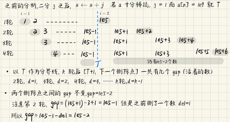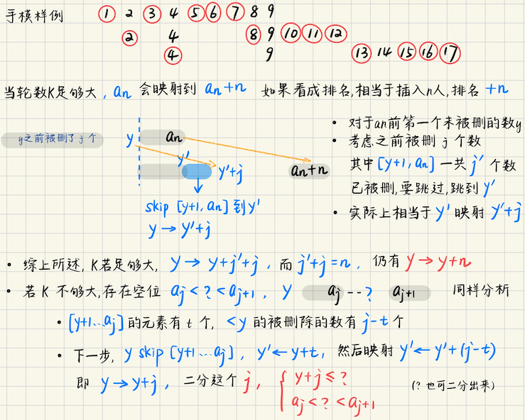 ## 约瑟夫环 **问题描述** 从标记$$1\sim n$$的圆圈,第$$1$$个人开始,每个人依次顺时针地杀死他旁边的,**仍然存活的人** 具体地,第一轮,编号是$$1$$的杀死编号$$2$$,接着编号$$3$$杀死编号$$4$$,以此类推 直到只有一个人幸存下来,问幸存下来的这个人,他的初始编号是多少? **算法分析** 考虑递归过程中,子问题和原问题之间,**编号的映射关系** > 子问题中,假设最后存活的人的编号是`J`,对应到原问题,编号是多少呢? **对于偶数的情况**  **对于奇数的情况**  递推关系如下 ```math \displaystyle \begin{cases} J(1) = 1 \\ J(2n) = 2J(n) - 1 \\ J(2n+1) = 2J(n) + 1 \end{cases} ``` **封闭形式** 根据$$J(2n) = 2J(n) - 1$$这样的递推形式,考虑$$J(n)$$的封闭形式,不妨先看$$n = 2^m$$的情形,$$J(2^m) = ?$$ > 当$$n = 2^m$$时 ```math \displaystyle J(n) = 2J(\dfrac{n}{2}) - 1 = 2\left( 2J(\dfrac{n}{2^2}) - 1 \right) - 1 \\ = 2^2 J(\dfrac{n}{2^2}) - 2^1 - 2^0 = 2^3 J(\dfrac{n}{2^3}) - 2^2 - 2^1 - 2^0 \\ = 2^m J(1) - 2^{m-1} - \cdots - 2^1 - 2^0 = 1 ``` 可知形如$$J(2^m) = 1$$ > 对于一般形式的递推,怎么求? 不难发现,$$J(2n+1) - J(2n) = 2$$,即可以先求出偶数项,然后根据偶数项来推相邻的奇数项 > 实际上 ```math \displaystyle J(2^m+1) = J(2^m) + 2 = 2 + 1 \\ \quad \\ J(2^m + 3) = J(2^m + 2) + 2 = 2J(2^{m-1} + 1) - 1 + 2 \\ =2\left( J(2^{m-1}) + 2 \right) + 1 = 6 + 1 ``` 以此归纳,不妨设$$n = 2^m + l$$,$$0 \leqslant l < 2^m$$,即将$$n$$分成若干个$$2^m$$段 记$$l$$是剩下的**不完整**的段,我们有$$J(2^m + l) = 2l + 1$$ ## 类似的下标映射问题 ### Codeforces Round 887 div1 #### A **[A. Ntarsis' Set](https://codeforces.com/problemset/problem/1852/A)** 给定一个很长的连续序列,$$1, 2, \cdots, 10^{1000}$$,可以认为是$$\mathbb{N}^{+}$$ 给定一个操作序列`a[1...n]`,每次操作**同时**删除编号(下标)是`a[1], a[2], ..., a[n]`的元素 然后后续的补齐,问操作`K`次后,排在第一的元素是? **算法分析** > 手模样例  > 其实也是有$$O(n)$$的做法的,只是有一些不易发现的性质   > **更重要的理解,基数排序,radix!从排名的角度来看** 假设说第`k`轮的答案是$$x$$,我们二分出最大的$$j, a\_j < x < a\_{j+1}$$,也就是说,**有`j`个数`< x`** 那么从第$$k \to k+1$$轮,相当于说**`x`的排名减少了`j`**,排名原来是`rank = x`,现在`rank = x - j` 我们二分最终的答案$$x$$,然后模拟`k`轮,如果最后的结果$$\leqslant 0$$,`x`就非法 否则`x`合法,最小的`x`就是使得最终`k 轮模拟完结果 rank = 1`的`x`