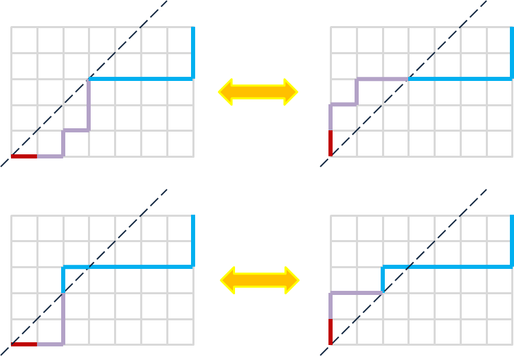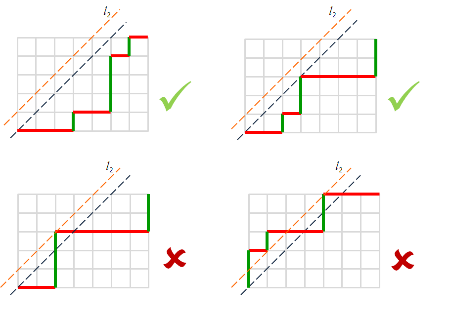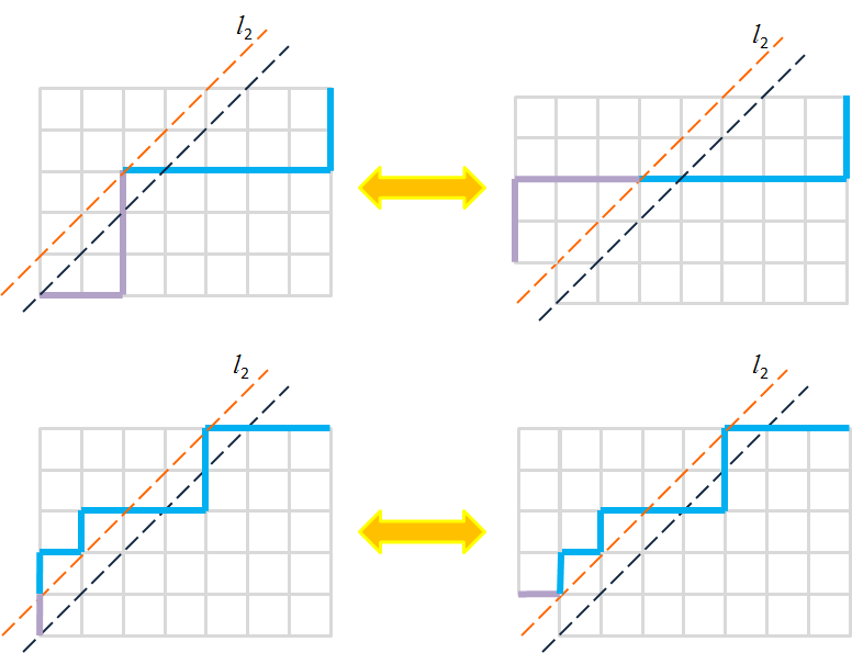 ## 不能接触对角线的格路问题 **问题描述** 假设要从$$(0, 0)$$到$$(m, n)$$,其中$$m > n$$,要求经过的每个点$$(a, b)$$ 除了起点外,都要满足$$a > b$$ 换句话说,从$$(0, 0)$$开始,每次向右走或者向上走,路径只能在$$y = x$$的**下方** 并且不能碰到$$y = x$$ **算法分析**  > 第一步一定是$$(0, 0) \to (1, 0)$$ 那么总的方案数,对应$$(1, 0) \to (m, n)$$的路径方案数 ```bash up: n 步 right: m-1 步 ``` 一共是$$m + n - 1$$步,方案数是$$\displaystyle \binom{n+(m-1)}{n}$$ 再来看不合法的方案数,每个不合法的方案数,**第一次接触对角线前的路径** 都可以**作关于对角线的对称**,两个问题是等价的 这时候不合法的方案数对应$$(0, 1) \to (m, n)$$的路径方案数 ```bash up: m 步 right: n-1 步 ``` 综上所述,不合法的方案数是$$\displaystyle \binom{m + (n - 1)}{m}$$ 最后的结果是$$\displaystyle \binom{(m-1) + n}{n} - \binom{m + (n-1)}{m}$$ ## 不能穿越对角线的格路问题 假设从$$(0, 0)$$到$$(m, n)$$,其中$$m \geqslant n$$,要求途经的节点满足$$(a, b), a \geqslant b$$ 可以碰到,但不能穿越 > 考虑将问题转化成不能触碰的格路问题  **将**$$y = x$$向上平移一个单位,转化成不能触碰的格路问题  这样,每条从$$(0, 0) \to (m, n)$$的,接触到$$l_2$$的路径,都对应一条从$$(-1, 1)$$出发 到达$$(m, n)$$的路径 总的路径数是$$\displaystyle \binom{m+n}{m}$$,不合法的路径对应$$(-1, 1) \to (m, n)$$ ```bash up: n-1 步 right: m+1 步 ``` 总的方案数是$$\displaystyle \binom{m+n}{m} - \binom{(m+1) + (n-1)}{m+1}$$