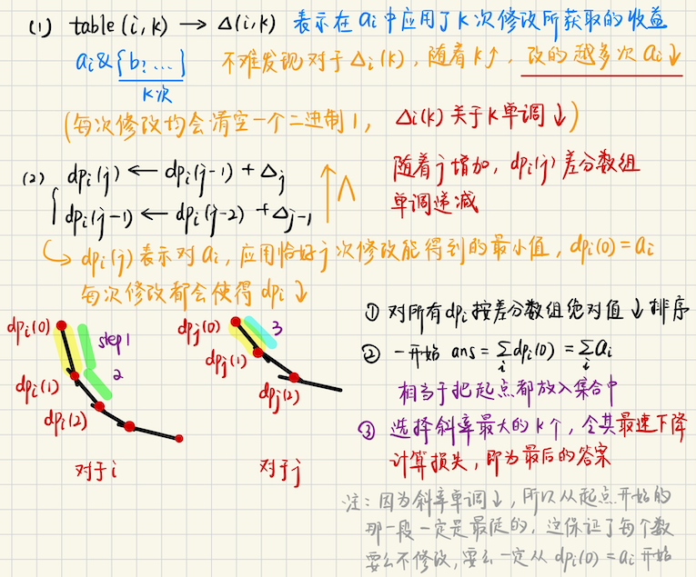 ## 凸壳优化初步 形如转移方程 ```math \displaystyle dp(i, j) = \max_{j' \in [l, r]} \{ dp(i-1, j') + K(i)X(j) \} ``` 有一项和$$i$$有关又与$$j$$有关的项,这个时候考虑凸壳优化,怎么去切入思考呢? 首先可以考虑的是,只关心$$dp_i(j)$$,只研究$$i$$这个阶段的状态,看看关于$$j$$有没有凸性 ### 凸壳优化举例 **[E. Kevin and And](https://codeforces.com/contest/2061/problem/E)** **问题描述** 给你一个长度是$$n$$的序列`a[1...n]`和长度为$$m$$的序列`b[1...m]`,你可以执行最多$$k$$次操作 每次操作,你可以选择$$(i, j)$$,令`a[i] &= b[j]`,最多`k`次操作下来,问$$a$$序列的和最小是多少? **算法分析** > 首先不难写出一个朴素的`dp` 由于$$m$$很小,我们可以暴力打表,`table(i, k)`表示对$$a_i$$应用$$k$$次操作,能得到最小的数是多少? 暴力枚举$$|B|$$中大小是$$k$$的子集,对每个$$i$$求出`table(i, k)`即可 那么可以写出一个朴素的$$dp$$方程 ```math dp(i, j) \xleftarrow{\min} dp(i-1, j') + table(i, |j - j'|), \quad |j - j'| \leqslant K ``` 其中$$dp(i, j)$$表示考虑前$$i$$个数,用了$$j$$次操作,能够得到的最小的和 枚举在$$i$$上浪费了多少次操作,类似背包,这样做的时间复杂度是$$O(n^2m^2)$$ 因为你需要枚举$$i, j, j'$$ > 考虑凸性