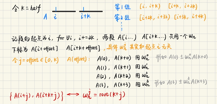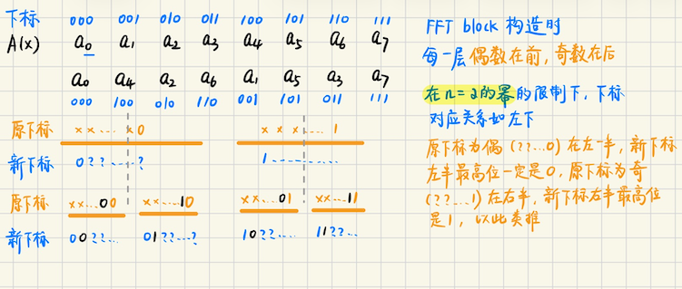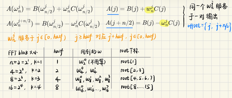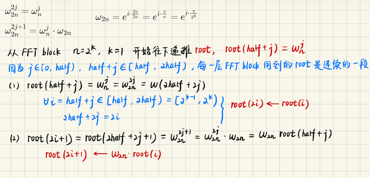 ## 背景 关于多项式计数问题,很多时候我们只需要取前$$n+1$$项 ```math A(x) = a_0 + a_1x + a_2x^2 + \cdots + a_nx^n \Rightarrow A(x) \bmod x^{n+1} ``` FFT/NTT 可以在$$O(n\log n)$$的复杂度内,实现两个$$n$$次多项式的乘积$$A(x)B(x)$$ ## 多项式的表示形式 假设$$f(x)$$是一个$$n$$次多项式,则$$f(x)$$的系数表示是 ```math \displaystyle f(x) = a_0 + a_1x + a_2x^2 + \cdots + a_{n-1}x^{n-1} + a_nx^n ``` 除此之外,$$f(x)$$还有**点值**表示,记为 ```math (x_0, f(x_0)), (x_1, f(x_1)), \cdots, (x_n, f(x_n)) ``` 这$$n+1$$个点值就可以表示一个$$n$$次多项式 在点值表示下,$$n$$次多项式乘法的复杂度是$$O(n)$$ ```math h(x) = f(x)g(x) \\ \quad \\ (x_0, f(x_0)) \cdots (x_n, f(x_n)) \\ (x_0, g(x_0)) \cdots (x_n, g(x_n)) \\ \Rightarrow (x_0, h(x_0)) \cdots (x_n, h(x_n)), \quad h(x_i) = f(x_i)g(x_i) ``` 那么怎么实现**从点值表示到系数表示的相互转化呢?**,FFT 就可以解决这个问题 ## 复数和单位根 复数具有指数形式$$a+bi = re^{i\theta}$$,其中$$r = \sqrt{a^2 + b^2}, \tan(\theta) = \dfrac{b}{a}$$ **单位根**,$$x^n = 1$$在复数域上的根称为$$n$$次单位根,$$n$$次单位根有$$n$$个 具有形式$$\displaystyle \omega_n^k = e^{i\frac{2k \pi}{n}}$$ > 证明 是因为欧拉公式$$e^{ix} = \cos x + i\sin x$$,比如复平面$$(1, 1)$$这个点表示$$1 + i$$ 实际上,用极坐标形式可以写成$$\sqrt{2}e^{i \frac{\pi}{4}}$$ 将$$x = \frac{\pi}{4}$$带入欧拉公式,$$\sqrt{2}e^{i \frac{\pi}{4}} = 1 + i$$ > 同理 取$$(\omega_n)^n = (e^{i \frac{2\pi}{n}})^n = e^{i \cdot 2\pi}$$ 相当于长度为`1`的线段,绕远点转一圈,回到了实轴上,恰好表示`1` 单位根的性质 ```math \displaystyle \omega_n^k = \omega_{2n}^{2k} \\ \omega_{2n}^{k+n} = -\omega_{2n}^k ``` > 证明 (1)很简单,考虑$$e^{i \frac{2k \pi}{n}}$$,`k, n`同时$$\times 2$$,答案不变 > (2)实际上只需要证明$$\omega\_{2n}^n = -1$$,实际上$$=e^{i\pi} = -1$$ (相当于绕着原点转`180`度,这里逆时针为正方向) ## DFT 将多项式 ```math \displaystyle A(x) = a_0 + a_1x + \cdots + a_{n-1}x^{n-1} ``` 转化成为点值形式$$(\omega\_{n}^k, A(\omega\_n^k)), \quad k = 0, 1, \cdots, n-1$$ 考虑$$n = 2^l$$,是`2 的幂`的情况,奇偶分开 ```math \displaystyle A(x) = (a_0 + a_2x^2 + \cdots + a_{n-2}x^{n-2}) + (a_1x + a_3x^3 + a_5x^5 + \cdots + a_{n-1}x^{n-1}) \\ B(x) = a_0 + a_2x + \cdots + a_{n-2}x^{n/2-1} \\ C(x) = a_1 + a_3x + \cdots + a_{n-1}x^{n/2-1} ``` 那么$$A(x) = B(x^2) + xC(x^2)$$ 对于$$0 \leqslant k < n/2$$ ```math \displaystyle A(\omega_n^k) = B(\omega_n^{2k}) + \omega_n^k C(\omega_n^{2k}) = B(\omega_{n/2}^k) + \omega_n^k C(\omega_{n/2}^k) ``` 对于$$k \geqslant n/2$$ ```math A(\omega_n^{k+n/2}) = B(\omega_n^{2k+n}) + \omega_n^{k+n/2} C(\omega_n^{2k+n}) \\ = B(\omega_n^{2k}) + \omega_n^{k+n/2} C(\omega_n^{2k}) = B(\omega_{n/2}^{k}) + \omega_n^{k+n/2} C(\omega_{n/2}^{k}) \\ = B(\omega_{n/2}^{k}) - \omega_n^k C(\omega_{n/2}^{k}) ``` > 以$$n = 8$$为例  ## DFT的蝴蝶变换 **bit-reversal permutation**  **注意保持`n`是`2 的幂`**,如果不满足,就尾项补`0`直到满足 ```bash x: [ ...... ] | ? rev(x): ? | [ 高位的翻转 ] 把最低位放到最高位 | 剩余的位翻转后右移 1 位以插入最高位 std::vector<int> rev; if (int(rev.size()) != n) { int k = __builtin_ctz(n) - 1; rev.resize(n); // coef index [a(0)....a(n-1)] for (int i = 0; i < n; i++) { rev[i] = (rev[i>>1] >> 1) | ((i & 1) << k); } } for (int i = 0; i < n; i++) { if (rev[i] < i) { // rev[i] < i 保证只交换一次,避免反复交换 std::swap(a[i], a[rev[i]]); } } ``` ## DFT root 的构造    注意到因为每一层$$j \in [0, half)$$,所以构造$$j' = half + j \in [half, 2half)$$ 可以保证这样的下标对应序列中**连续的一段**,`for`$$\forall i \in [2^{k-1}, 2^k)$$ ```bash root[2i] = root[i] root[2i + 1] = root[i] ``` ## DFT 迭代蝶形合并 ```bash for k = half, k <<= 1: for i = 起点 in [i, i+2k, ...], 考虑两段 [i...), [i+k...), then i += 2k: for j = offset in [0, half) = [0, k): auto u = a[i+j], v = [i+k+j] * root[k+j] 迭代: a[i+j] = u + v; a[i+k+j] = u - v; ``` ## IDFT 将多项式的点值表示$$(\omega_n^k, A(\omega_n^k)=b_k), k = \\{0, 1, \cdots, n-1\\}$$转化为其系数表示 ```math \displaystyle A(x) = a_0 + a_1x + \cdots + a_{n-1}x^{n-1} ``` 实际上 ```math \displaystyle \begin{pmatrix} (\omega_n^0)^0 & (\omega_n^0)^1 & \cdots & (\omega_n^0)^{n-1} \\ (\omega_n^1)^0 & (\omega_n^1)^1 & \cdots & (\omega_n^1)^{n-1} \\ \vdots & \vdots \\ (\omega_n^i)^0 & (\omega_n^i)^1 & \cdots & (\omega_n^i)^{n-1} \\ \vdots & \vdots \\ (\omega_n^{n-1})^0 & (\omega_n^{n-1})^1 & \cdots & (\omega_n^{n-1})^{n-1} \end{pmatrix} \begin{pmatrix} a_0 \\ a_1 \\ \vdots \\ a_i \\ \vdots \\ a_{n-1} \end{pmatrix} = \begin{pmatrix} b_0 \\ b_1 \\ \vdots \\ b_i \\ \vdots \\ b_{n-1} \end{pmatrix} ``` 设$$n \times n$$的矩阵$$\Omega$$,其中$$\Omega\_{i, j} = \omega_n^{ij}$$ 设向量$$\bold{a} = (a\_0, a\_1, \cdots, a\_{n-1}), \bold{b} = (b\_0, b\_1, \cdots, b\_{n-1})$$ 那么 IDFT 相当于求解方程 ```math \displaystyle \Omega\bold{a} = \bold{b} ``` > 问题转化成,求$$\Omega^{-1}$$ 那么我们有 ```math \displaystyle \begin{pmatrix} a_0 \\ a_1 \\ \vdots \\ a_i \\ \vdots \\ a_{n-1} \end{pmatrix} = \Omega^{-1} \begin{pmatrix} b_0 \\ b_1 \\ \vdots \\ b_i \\ \vdots \\ b_{n-1} \end{pmatrix} ``` 考虑**共轭** ```math \overline{\Omega} = \begin{pmatrix} (\omega_n^{-0})^0 & (\omega_n^{-0})^1 & \cdots & (\omega_n^{-0})^{n-1} \\ (\omega_n^{-1})^0 & (\omega_n^{-1})^1 & \cdots & (\omega_n^{-1})^{n-1} \\ \vdots & \vdots \\ (\omega_n^{-i})^0 & (\omega_n^{-i})^1 & \cdots & (\omega_n^{-i})^{n-1} \\ \vdots & \vdots \\ (\omega_n^{-(n-1)})^0 & (\omega_n^{-(n-1)})^1 & \cdots & (\omega_n^{-(n-1)})^{n-1} \end{pmatrix} ``` 那么$$M = \overline{\Omega} \cdot \Omega$$,考虑$$\overline{\Omega}$$第`i`行乘上$$\Omega$$第`j`列,我们有 ```math \displaystyle M_{i, j} = (\omega
