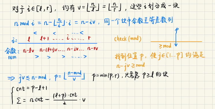 ## 整除分块 整除分块可以处理类似 ```math \displaystyle \sum\left( \lceil \dfrac{a_i}{k}\rceil - \lceil \dfrac{a_{i-1}}{k} \rceil \right) ``` 或者对$$\sum (n \bmod i)$$之类的问题 ### 引入 **[智乃与模数](https://ac.nowcoder.com/acm/contest/95335/G)** 输入一个`n`,现在把所有的`i = {1, 2, ..., n}`,求$$(n \bmod i)$$,然后将结果单调递减排列 求前`k`个数的和 **算法分析** 求类似$$\sum (n \bmod i)$$,考虑整除分块 **性质** 1)每一个块的元素,$$i \in [l, r]$$,$$\lfloor \dfrac{n}{i} \rfloor$$的结果都是$$v = \lfloor \dfrac{n}{l} \rfloor$$ 2)每一个块,$$(n \bmod i)$$即**余数呈等差数列**,并且按递减顺序排列 余数分别是 ```bash 块 [l, r],商是 v = (n / l) 余数按等差数列递减排列 {n-lv, n-(l+1)v, n-(l+2)v, ....., n-rv} ``` 回到这个问题,前`k`个数的和怎么求呢?我们需要知道前`k`个数对应的$$n \bmod i$$**余数是多少** 假设说我们钦定余数是$$t$$,那么我们需要确定,**余数**$$\geqslant t$$的数有多少个? 不难想到**二分余数**,二分**最后一个**`r`,使得$$1\sim n$$的所有数中 满足`n mod (这些数)`的余数$$\geqslant r$$的“这些数”有$$< K$$个,具体有多少个呢?假设说`cnt`个 那么还差$$K - cnt$$个,此时令`r -= 1`,就一定可以 最后一小段余数都是`r - 1`,恰好有$$K - cnt$$个 > 接下来考虑`check(余数) = 有多少个 [1, n] 中的数满足,(n mod 这些数) >= 余数`  其中`check`很好写,遍历每一个块依次计算即可,求和也不难,是朴素的等差数列求和 最后剩余的`mod = r - 1`填充到`K`,不会取遍所有的数,而只会取一部分 好在这些数的余数都相等,都是`r - 1`,只需要`K - cnt`个,还缺少的贡献是`(K - cnt) * (r - 1)` 把这部分缺少的加上即可 ### 算法实现 ```bash using arr = array<int, 3>; void solve() { int n, k; cin >> n >> k; vector<arr> block; for (int l = 1, r; l <= n; l = r + 1) { int v = n / l; r = n / v; block.push_back({l, r, v}); } auto check = [&](int mod) { int cnt = 0; i64 sum = 0; for (auto [l, r, v] : block) { auto p = (n - mod) / v; p = min(p, r); if (l > p) continue; cnt += p - l + 1; sum += (i64)(p-l+1) * n - (i64)(l+p) * (p-l+1) * v / 2; } return pair(cnt, sum); }; int l = 0, r = n; while (l < r) { auto mid = (l + r) >> 1; auto [cnt, sum] = check(mid); if (cnt < k) r = mid; else l = mid + 1; } auto mod = r; auto [cnt, sum] = check(mod); if (k > cnt) { auto d = k - cnt; sum += (i64)(mod - 1) * d; } cout << sum << "\n"; } ```
