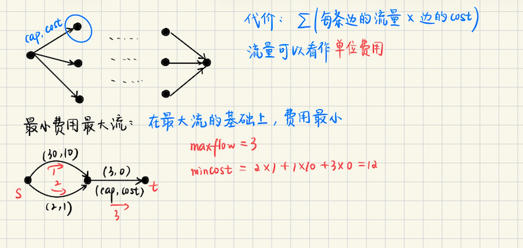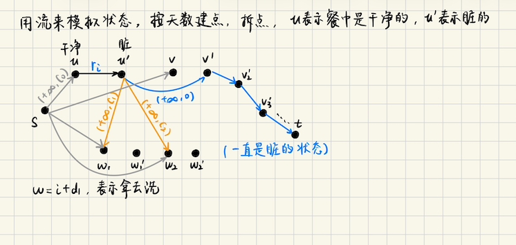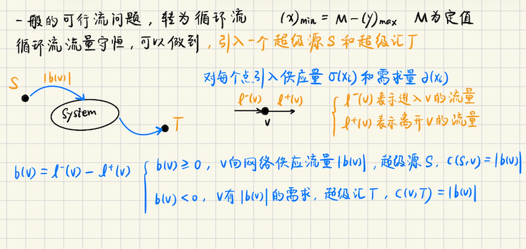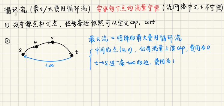 ## 费用流 **费用流问题**  **循环流**  ## 最小费用最大流算法 **基于 EK 的 MCMF 算法** 1)构建残量网络,正向边的边权是`cost`,反向边的边权记为`-cost` 反向边相当于**撤销操作** 2)考虑**对流量增广**,沿着最短路(关于费用最小)增广,边权就是**费用** ### 找最短路 找最短路的方法,可以用 SPFA,或者 Johnson 消负权的 dijkstra #### Johnson 消负权 dijkstra 定义**势函数**$$h(u)$$,保持原图的最短路径相对不变 **添加虚拟原点** 在原图中添加一个虚拟源点$$s$$,并且从$$s$$到**原图的所有节点**添加边权是`0`的边,生成一个新图$$G$$ **新图运行 Bellman-Ford** 从`s`开始跑`SPFA(s)`,计算从`s`到每个节点$$v \in V$$的最短路径距离$$h(v)$$ 如果检测到负环,算法终止 **Johnson 消负权** 对于原来的每条边`(u, v)`,定义权重 ```math \displaystyle w'(u, v) = w(u, v) + h(u) - h(v) ``` **运行 Dijkstra** 在新图上执行`dijkstra(u)`,即可以求出从`u`到所有节点的**调整后的最短路径** **恢复原路径距离** ```math \displaystyle d(u, v) = d'(u, v) - h(u) + h(v) ``` > 证明 新权重,因为我们先执行了一遍`Bellman-Ford`,$$h_v \leqslant h_u + w(u, v)$$ 从而$$w'(u, v) = w(u, v) + h(u) - h(v) \geqslant 0$$ 这样所有的边都是非负的 > 等价性 新路径的总权重,$$s \to p_1 \to p_2 \cdots \to p_k \to t$$ ```math \displaystyle (w(s, p_1) + h_s - h_{p_1}) + (w(p_1, p_2) + h_{p_1} - h_{p_2}) + \cdots + (w(p_k, t) + h_{p_k} - h_t) \\ = w(s, p_1) + w(p_1, p_2) + \cdots + w(p_k, t) + h_s - h_t ``` 其中$$h_s - h_t$$是定值,所以新路径的总权重等于$$\sum w$$,即原路径的总权重 那么对新图求最短路,自然等于原图 **特别说明** 在最小费用最大流问题中,我们往往是将反向边设置为$$(cap, cost) = (0, -c)$$ 在一开始的时候,因为反向边的`cap = 0`,一开始并不会真的跑反向边的负权 那么对应的此时边权都是非负,我们在非负图上确定势能函数`h` 所以在最小费用最大流问题中,一开始可以直接跑 dijkstra,而不必先跑 spfa **算法实现** ```bash template <typename T> class Graph { public: struct _Edge { int from; int to; T cap; }; int _n; vector<_Edge> e; vector<vector<int> > g; vector<T> dis; // 用于 Johnson 消负权,虚源默认是 0 int src = 0; vector<T> h; // Johnson 消负权所需要的 info // 其余代码省略 bool JohnsonPre() { // 只调用一次,获取势能 // 实现的时候正常加边,不加虚源,johnson 所需的源节点在 Johnson 方法中考虑 // src to all nodes, w(src, u) = 0 for (int u = 1; u <= this->_n; u++) addEdge(src, u, 0); if (spfa(src) == false) return false; this->h = this->dis; // 备份边表,调整边表 for (auto &[from, to, cap] : e) { cap += h[from] - h[to]; // assert(cap >= 0); } return true; } void Johnson(int s) { dijkstra(s); for (int u = 0; u <= this->_n; u++) { if (dis[u] < inf<T>) { dis[u] = dis[u] + h[u] - h[s]; } } } void JohnsonDone() { // 恢复原来的边权 for (auto &[from, to, cap] : e) { cap -= h[from] - h[to]; } } }; ``` #### MCMF 算法实现 **关于负环** 负环是可能存在的,但是绕负环的时候,必须要有**流**过去,可能一次增广之后 这条边就满流了(相当于从残量网络中删掉),满流之后负环就绕不了了 在负环上,绕行的流量只能是$$\max |f|$$(负环上最大边的流量),绕完之后就不会再进入负环了 (可以看作绕一遍就把负环删掉) MCMF 默认**初始图**不带负环,有几种情况 1)边权都是正的 2)整个图是一个 DAG 增广之后的残量网络呢? 增广的过程,**最短路是会越来越大**(关于费用的最短路) > 假设说最短路会变小,那意味着存在撤销操作,既然撤销了,为什么一开始不走那条更短的路?矛盾 **时间复杂度** 时间复杂度是$$O(|f| \cdot \text{spfa})$$,其中$$|f|$$是指增广次数 而`SPFA`的上界是$$O(nm)$$,所以这样做的代价是$$O(|f| \cdot nm)$$ ```bash template<class T> struct MinCostFlow { public: struct _Edge { int to; T cap; T cost; _Edge(int to_, T cap_, T cost_) : to(to_), cap(cap_), cost(cost_) {} }; int n; vector<_Edge> e; vector<vector<int> > g; vector<T> h, dis; vector<int> pre; MinCostFlow() {} MinCostFlow(int n_) { init(n_); } void init(int n_) { n = n_; e.clear(); g.assign(n+5, {}); } void addEdge(int u, int v, T cap, T cost) { g[u].push_back(e.size()); e.emplace_back(v, cap, cost); g[v].push_back(e.size()); e.emplace_back(u, 0, -cost); } bool spfa(int s) { dis.assign(n+5, numeric_limits<T>::max()); pre.assign(n+5, -1); vector<bool> inq(n+5, 0); vector<int> cnt(n+5, 0); queue<int> que; dis[s] = 0; que.push(s), inq[s] = true, cnt[s]++; while (!que.empty()) { int u = que.front(); que.pop(); inq[u] = 0; for (int i : g[u]) { int v = e[i].to; T cap = e[i].cap; T cost = e[i].cost; if (cap > 0 and dis[v] > dis[u] + cost) { dis[v] = dis[u] + cost; pre[v] = i; if (!inq[v]) { que.push(v), inq[v] = 1, cnt[v] += 1; if (cnt[v] > n) { return true; } } } } } h.assign(n+5, 0); for (int i = 0; i <= n; i++) { if (dis[i] != numeric_limits<T>::max()) h[i] = dis[i]; } return false; } bool dijkstra(int s, int t) { dis.assign(n+5, numeric_limits<T>::max()); pre.assign(n+5, -1); priority_queue<pair<T, int>, vector<pair<T, int> >, greater<pair<T, int> > > que; dis[s] = 0; que.emplace(0, s); while (!que.empty()) { T d = que.top().first; int u = que.top().second; que.pop(); if (dis[u] != d) continue; for (int i : g[u]) { int v = e[i].to; T cap = e[i].cap; T cost = e[i].cost; if (cap > 0 and dis[v] > d + h[u] - h[v] + cost) { dis[v] = d + h[u] - h[v] + cost; pre[v] = i; que.emplace(dis[v], v); } } } return dis[t] != numeric_limits<T>::max(); } pair<T, T> flow(int s, int t, bool use_spfa = false) { T flow = 0; T cost = 0; if (use_spfa) { bool neg = spfa(s); if (neg) { return make_pair(-1, -1); } } else { h.assign(n+5, 0); } while (dijkstra(s, t)) { for (int i = 0; i <= n; i++) { if (dis[i] != numeri