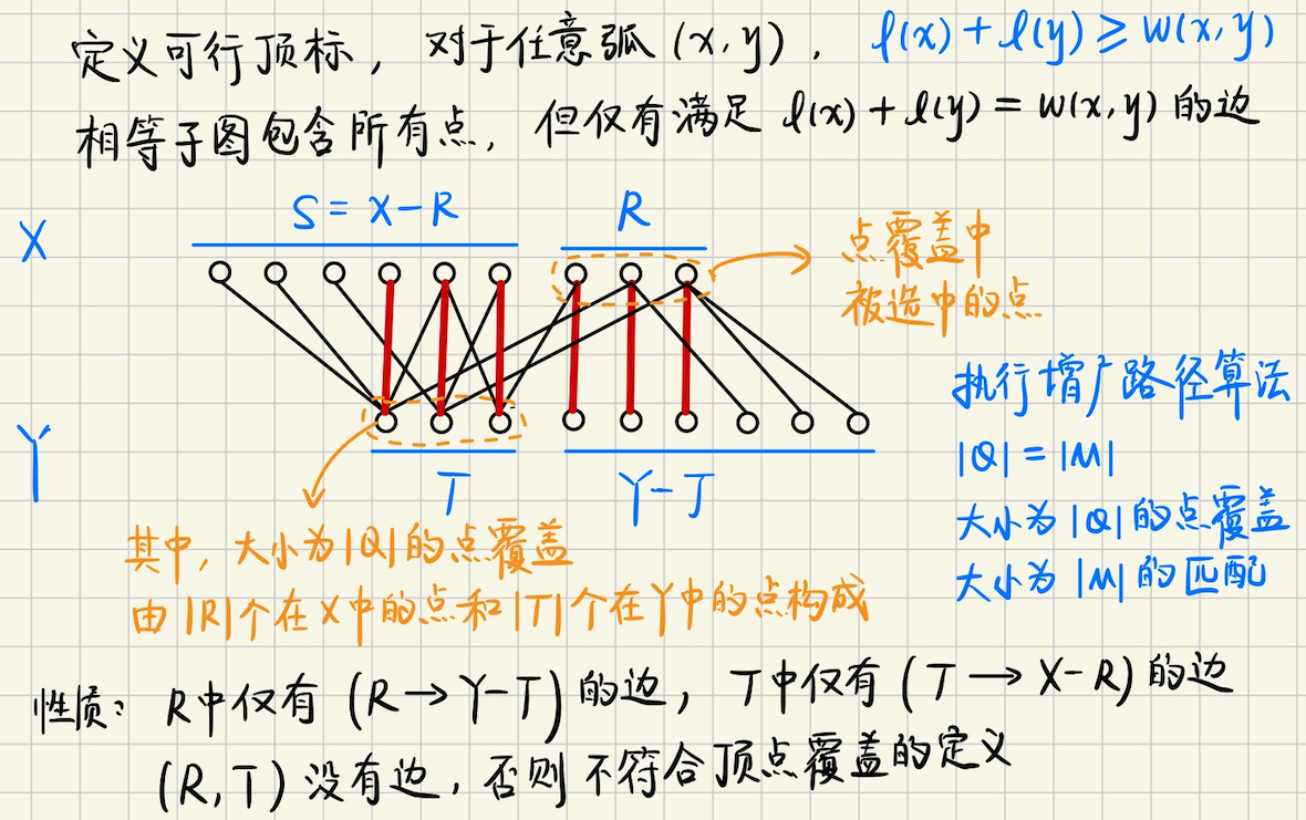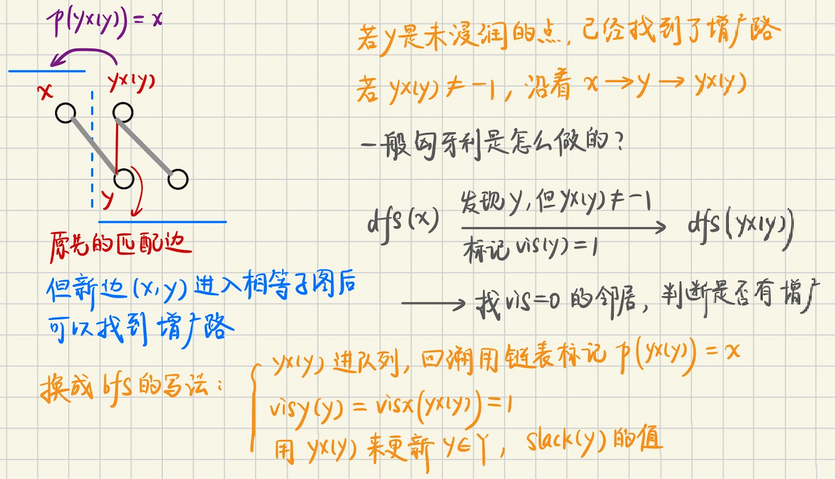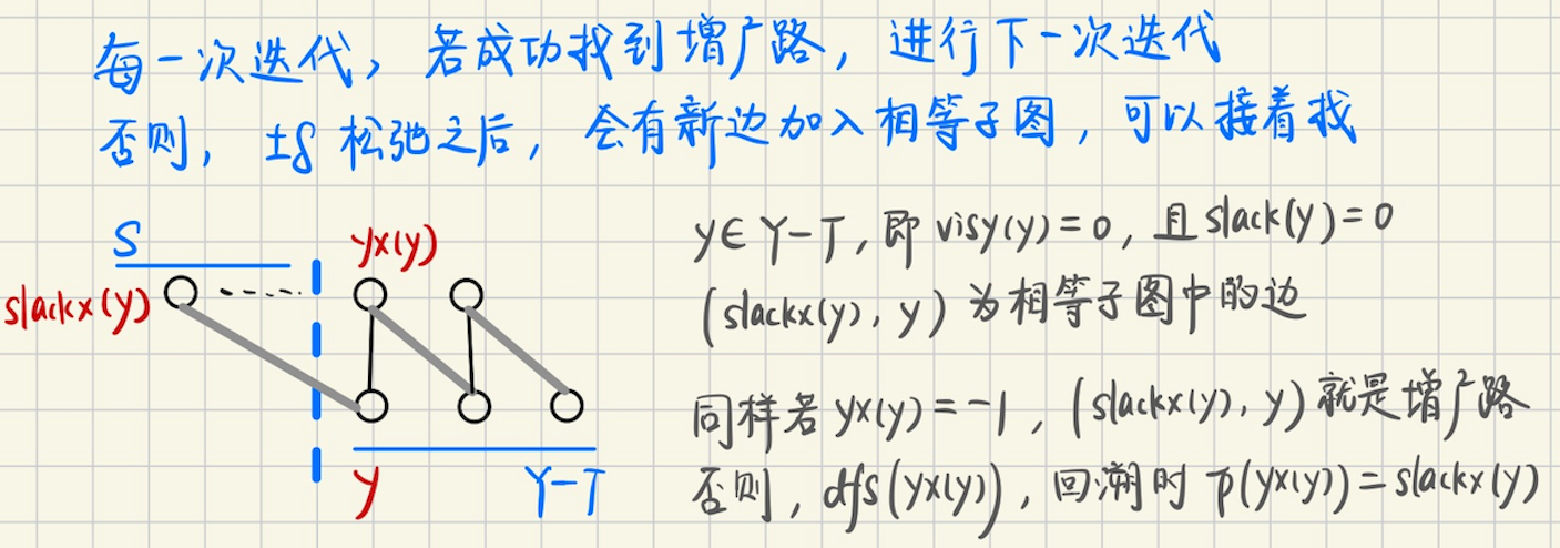 ## 二分图带权匹配 考虑处理的图是完全图$$K\_{n, n}$$,如果不满足,可以插入缺少的边,并让其权值为`0` 我们处理的各个边都是非负权值的,所以有某个权值最大的匹配是完美匹配,考虑最大权匹配及其对偶问题 ### 加权二分匹配及其对偶 **问题模型** 有$$n$$个农场生产玉米,$$n$$个加工厂,农产$$i$$生产的玉米,给加工厂$$j$$,产生利润$$w(i, j)$$ 现在需要找到一个匹配,使得总利润最大 同时,政府希望少生产点玉米,如果农业公司不选择农场$$i$$,政府补贴$$u_i$$,如果不使用加工厂$$j$$,政府补贴$$v_j$$ 政府支付的补贴,必须对所有$$i, j, \quad u_i + v_j \geqslant w(i, j)$$成立,同时希望有一个方案,使得$$\sum u_i + \sum v_j$$最小 **定义** **最大权匹配** 一个$$n \times n$$矩阵的**截断**,每行每列各取一个元素得到的$$n$$个位置,找出和最大的一个截断,这就是**最大权匹配问题** 将非负权值$$w(i, j)$$分配给$$K\_{n, n}$$的边$$(x_i, y_j)$$,找出完美匹配$$M$$使得$$w(M)$$最大 **最小权覆盖** 给定所有边的权值,对标记$$\\{u_1, u_2, \cdots, u_n\\}, \\{v_1, v_2, \cdots, v_n\\}$$适当选择 使得$$u_i + v_j \geqslant w(i, j)$$对任意$$i, j$$均成立,覆盖$$(u, v)$$的代价$$c(u, v) = \sum u_i + \sum v_j$$ 最小权覆盖,使得最小的一个覆盖 **最小权匹配** 很简单,选一个很大的$$M$$,然后权值调整成$$M-w(i, j)$$,求最大权匹配 ### 对偶性 对于加权二分图$$G$$的一个完美匹配$$M$$和加权覆盖$$c(u, v)$$,有$$c(u, v) \geqslant w(M)$$ 并且$$c(u, v) = w(M)$$当且仅当$$M$$是满足$$u_i + v_j = w(i, j)$$的边$$(x_i, y_i)$$组成的 简单来说,最大权匹配 = 最小权覆盖 > 证明 > 必要性,在$$M$$的每一条边上,对约束$$u_i + v_j \geqslant w(i, j)$$求和,就有$$c(u, v) \geqslant w(M)$$ 充分性,$$c(u, v) \geqslant w(M)$$对任意匹配和覆盖都成立,$$c(u, v) = w(M)$$就表明最优了 ## 匈牙利算法 **相等子图** 是$$G$$的生成子图,但是只包括满足$$l(x) + l(y) = w(x, y)$$的边$$(x, y)$$ 其中$$l(x)$$是可行顶标,必须满足$$l(x) + l(y) \geqslant w(x, y)$$  **算法思路** 不难想到,任意构造一个可行顶标,比如$$Y$$的顶标是$$0$$,$$X$$的顶标取从它出发的所有边的最大权值 然后取相等子图的最大匹配 如果存在完美匹配,那么算法终止,否则修改顶标,使得相等子图的边变得更多,则有更大机会存在完美匹配 **怎么修改顶标呢?考虑一些性质** 1.$$(X-R, Y-T)$$是没有边的,否则可以继续增广,因为$$R$$已经是增广路径算法找到的,$$\in X$$的最大点覆盖了 另外,$$(R, T)$$的边均为非匹配边,因为$$R, T$$都是$$\in |Q|$$的点覆盖 因为`最小点覆盖 = 最大匹配`,点覆盖中的任意两个点,都是非匹配边 2.令$$S = X-R$$,在相等子图上执行增广路径算法,考虑**匹配边**$$(S, T) \leftarrow (X-R, T)$$ 怎么修改顶标呢?首先要保证**原来的匹配边**$$(S, T)$$不会离开相等子图 可以考虑将$$S$$中所有点的顶标$$-\delta$$,同时$$T$$中所有点的顶标$$+\delta$$ 这样,原来相等子图中没有$$(S, Y-T)$$的边,将$$S$$中的顶标减小一定的数$$\delta$$之后 就可能有$$(S, Y-T)$$的**新边加入相等子图**,不断调整顶标,使得相等子图中的边尽可能多 3.那么,接下来的问题主要就是,$$\delta$$应该取多少? 对于相等子图,必须保证$$l(x) + l(y) \geqslant w(x, y)$$恒成立 首先,原来的相等子图,$$(S, T): \quad l(x) + \delta, \ l(y) - \delta$$,其中$$l(x) + l(y)$$是不变的 仍然能够保证$$l(x) + l(y) \geqslant w(x, y)$$ 现在考虑将新边$$x \in S, y \in Y-T$$加入相等子图,是否仍然保持恒成立?实际上 ```math \displaystyle \begin{cases} l'(x) = l(x) - \delta \\ l'(y) = l(y) \end{cases} ``` 那么我们需要$$l'(x) + l'(y) = l(x) - \delta + l(y) \geqslant w(x, y)$$恒成立 也就是说,我们要保证$$\delta \leqslant l(x) + l(y) - w(x, y)$$恒成立 我们取$$\delta = \min(l(x) + l(y) - w(x, y))$$即可 **匈牙利算法** 给$$T$$中的每个点$$y$$定义松弛量$$\text{slack}(y) = \min\\{l(x) + l(y) - w(x, y)\\}$$ 在算法执行的时候,维护相等子图的$$(S, T)$$,迭代的时候考虑$$T'$$中的点 令$$\delta = \min \\{\text{slack}(y), \quad y \in Y-T \\}$$,继续增广 ### 算法实现 如果边$$(x, y)$$加入相等子图,那么有如下两种情况 情况一,如果$$y$$未浸润,那么找到增广路 情况二,如果$$y$$已经和$$S$$中的点$$yx(y)$$匹配,那么将$$yx(y), y$$分别加入$$S, T$$中 为了实现匈牙利算法,还需要定义一些东西 首先是,对于$$x \in S$$,枚举$$y \in Y$$中的每个节点 定义**松弛量**$$\text{slack}(y) = \min \\{lx(x) + ly(y) - w(x, y)\\}$$ 实际松弛的时候,我们用`visy(y) = {1 or 0}`来标记$$y$$是在$$T$$集中,还是$$Y-T$$集中 根据之前的分析,新加入**相等子图**的边$$(x, y)$$,满足$$x \in X, y \in Y-T$$ 并且有$$lx(x) + ly(y) = w(x, y)$$ 另外还有,相等子图中,$$\text{slack}(y) = \min \\{lx(x) + ly(y) - w(x, y) \\}$$ 每次迭代中,**新加入**的每个$$x \in S$$,都可能会对$$\text{slack}(y)$$有影响  > 用 bfs 来实现匈牙利算法 **基本算法框架** 1.迭代$$nx$$次,每次迭代都尝试找出**一条**增广路$$(ex, ey)$$,具体怎么找呢? 2.和朴素匈牙利算法框架一样,一开始时候`visx, visy, p, slack`数组清空 ```bash visx.assign(nx, 0), visy.assign(ny, 0) slack.assign(ny, +infty) p.assign(nx, -1) ``` 先扩张$$S$$集,把未浸润的点,满足$$xy(x) = -1$$的$$x$$进队列(相当于`dfs(x)`) 然后进行`bfs`,每次取队头元素 3.注意到此时队列中的元素,都是满足$$xy(x) = -1$$的未匹配点,如果能够在**相等子图**中找到$$y \in Y$$ 并且$$yx(y) = -1$$,那么$$(x, y)$$就是增广路,具体来说 考虑所有$$y \in Y-T$$(即`visy(y) = 0`)的点$$y$$,如果$$lx(x) + ly(